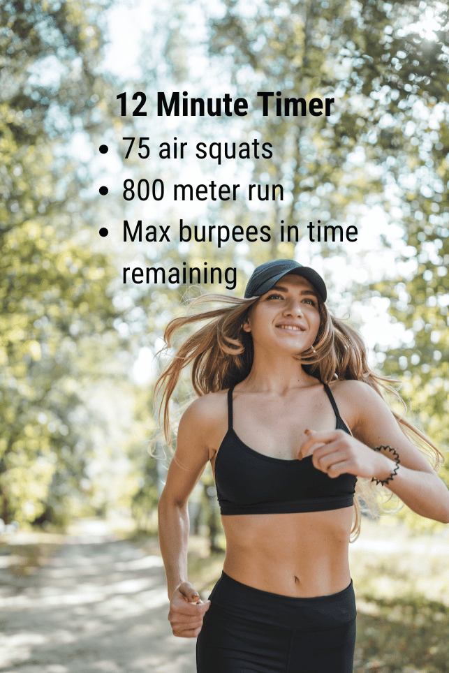 Set a timer for 12 minutes. At the start of the timer complete 75 air squats. Next run 800 meters. With whatever time you have remaining complete as many burpees as possible.