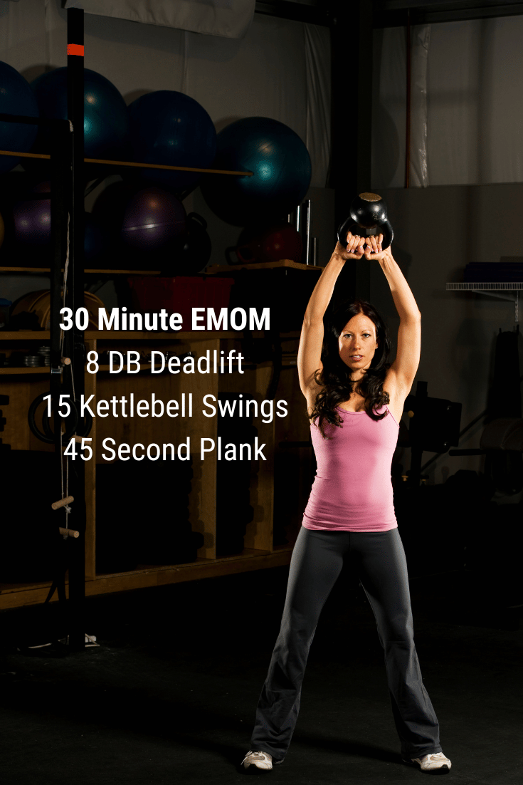For this workout you’ll be setting a timer for an EMOM. That means every minute you’ll start a new movement for a total of 30 minutes. At the start of the timer you’ll complete 8 Dumbbell Deadlifts. You’ll rest the remainder of the minute. At the start of the next minute you’ll complete 15 Kettlebell swings. Rest the remainder of the minute. Then you’ll complete a 45 second plank. Rest the remainder of the minute. Repeat this sequence for a total of 10 rounds each movement. This will start off seemingly easy, but as you begin to fatigue it will get more challenging.