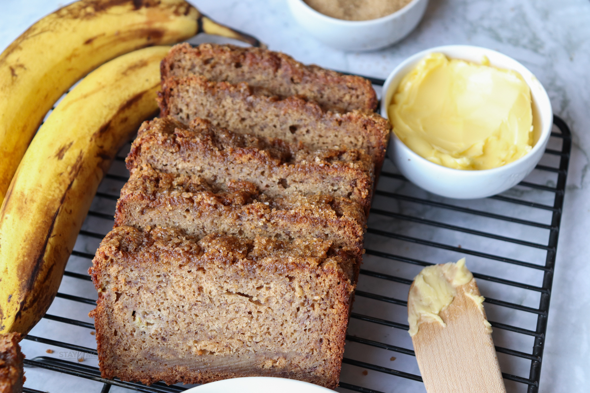 Today I’m here with a classic favorite, but make it a bit more macro friendly, Banana Bread recipe! All too often I have uneaten, overripe bananas sitting on my counter. Sometimes I slice them up and freeze them for smoothies, but other times I love to use them for this Banana Bread that everyone in my family loves. It has a yummy crystal topping that just take it to the next level! My favorite wait to eat this banana bread it to spread some butter on top. So good!! Give this one a try!