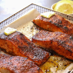 After posting my Panko Baked Salmon recipe last month, I knew I needed to get my Blackened Salmon recipe up on the blog for you all to enjoy. My version is cooked in the air fryer with a delicious blend of spices and some brown sugar mixed in. This recipe is so full of flavor and the salmon comes out tender and flaky and just so, so good! Pair this with your favorite rice, pasta, veggies or anything else you love for an easy and delicious meal!