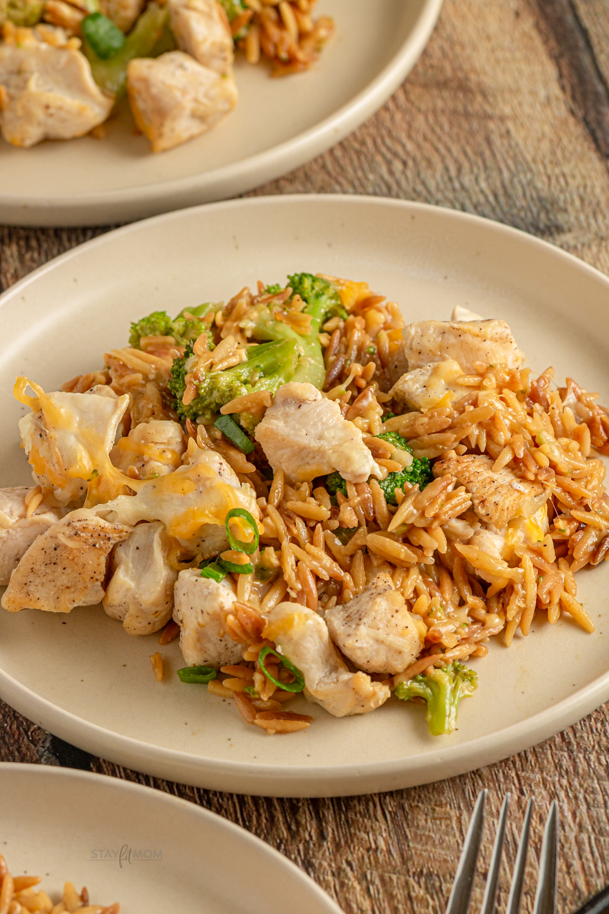 Search “Stay Fit Mom Broccoli Cheddar Chicken Orzo in MyFitnessPal or MacrosFirst for easy tracking.