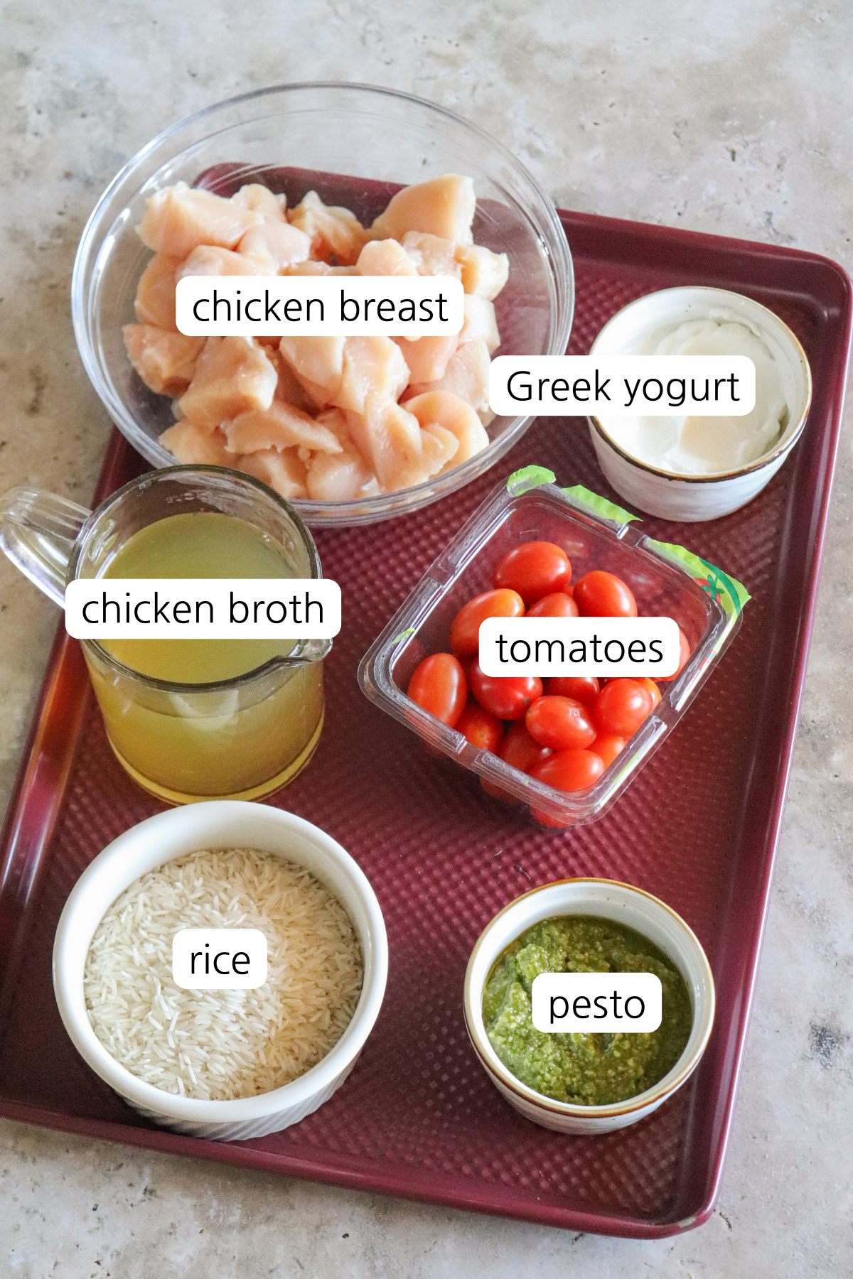 - To each container add 2 tablespoons rice, 5 ounces chicken, 1 tablespoon of both pesto and yogurt, and 1/4 cup of broth. Stir well.
