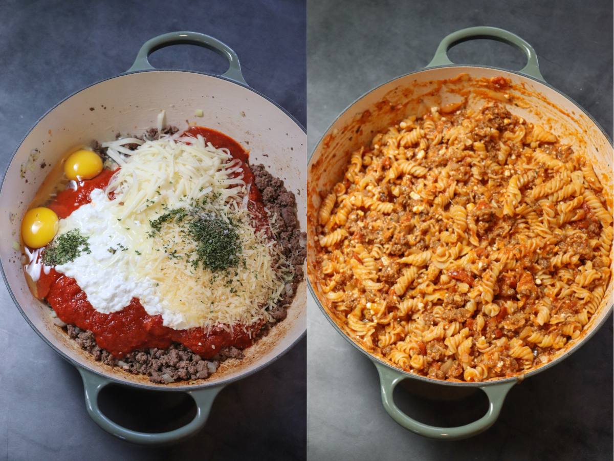 - In a lightly greased, large casserole dish (9×13), dump your noodle mixture and spread evenly. Then dump your meat mixture over the top and spread evenly. Top with the remaining mozzarella cheese.