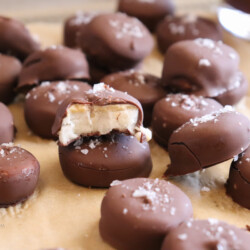 - Using a toothpick or spoon, submerge each frozen slice into the chocolate. Twirl and shake the excess chocolate off before setting back on the sheet pan. Top with a pinch of salt immediately, before the chocolate sets.