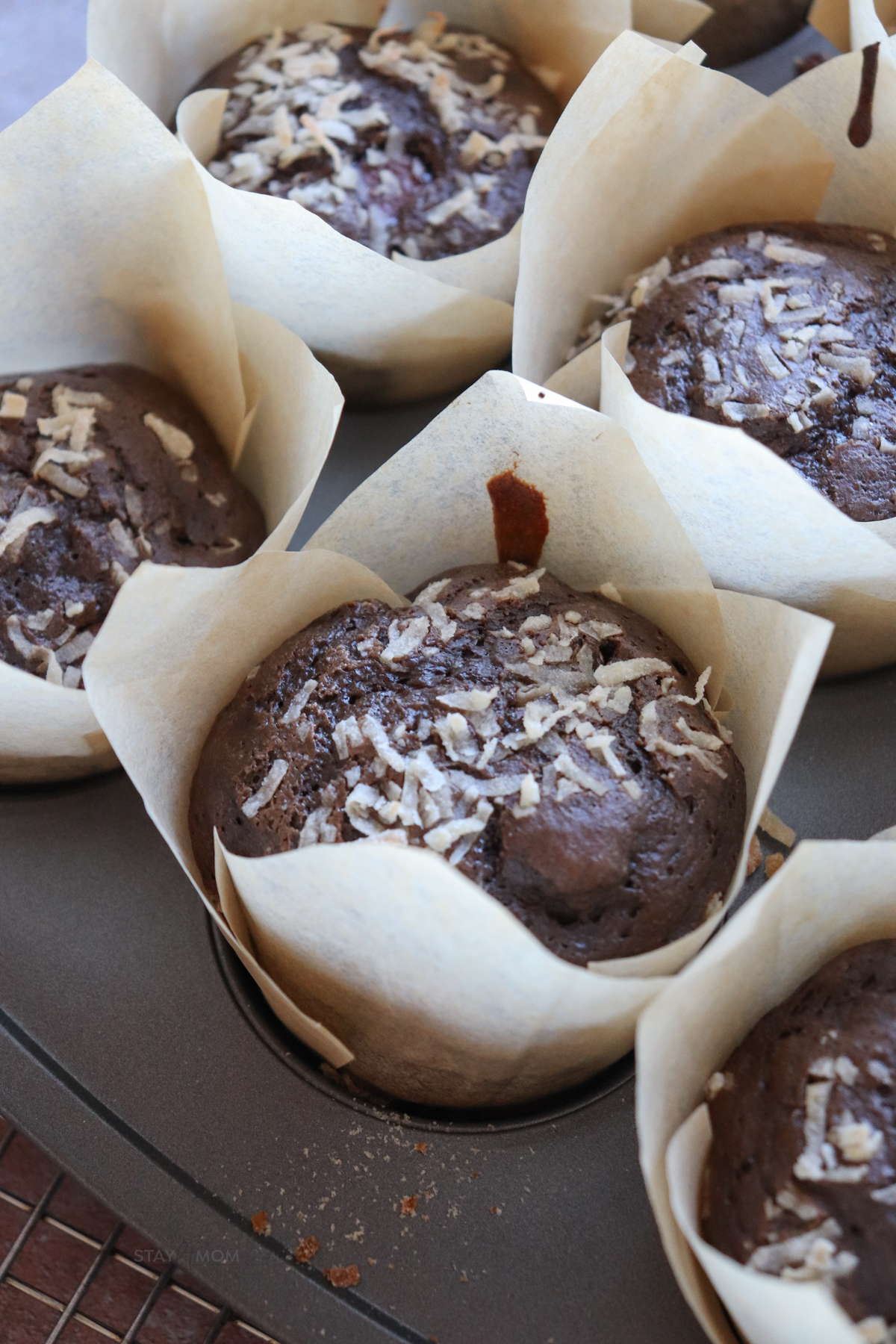 - Pour into lined or a silicone muffin tin. Fill each cup about 3/4 of the way. It should make 12 muffins. Top each muffin with the chocolate chips and coconut flakes.