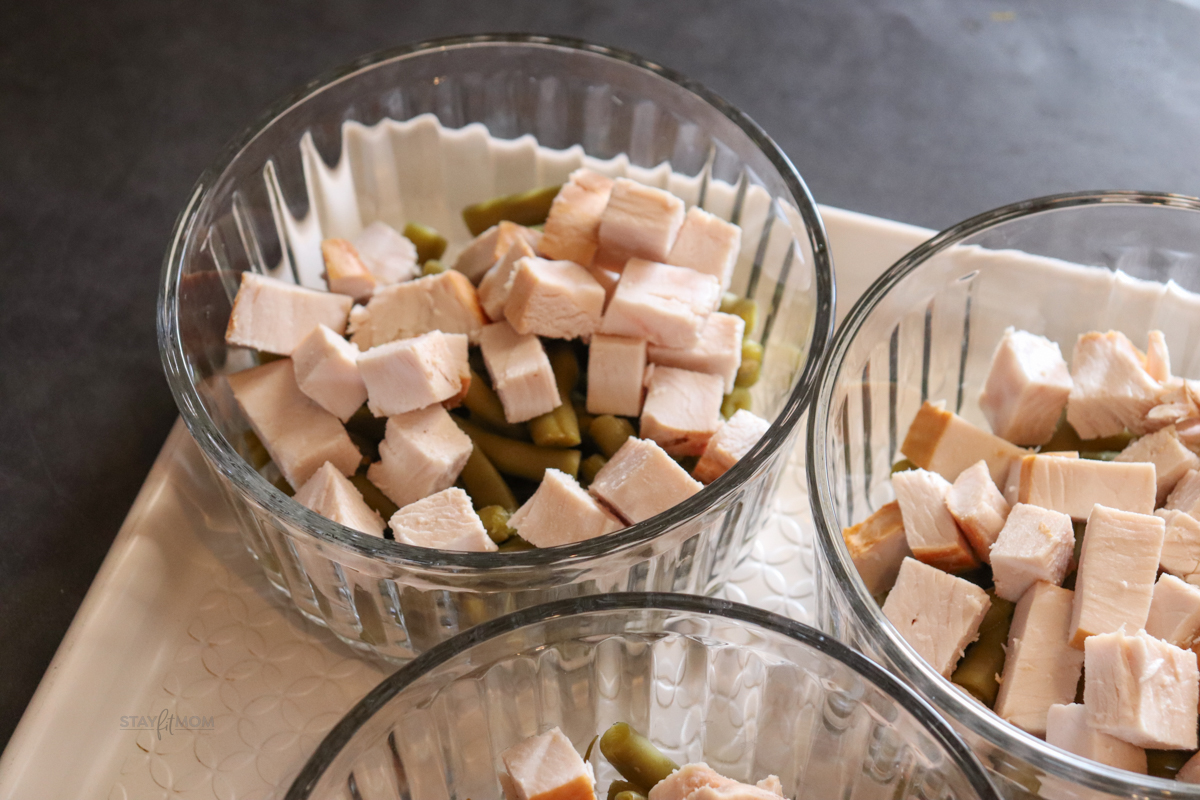 - Divide the green beans and turkey evenly amongst the 5 bowls.