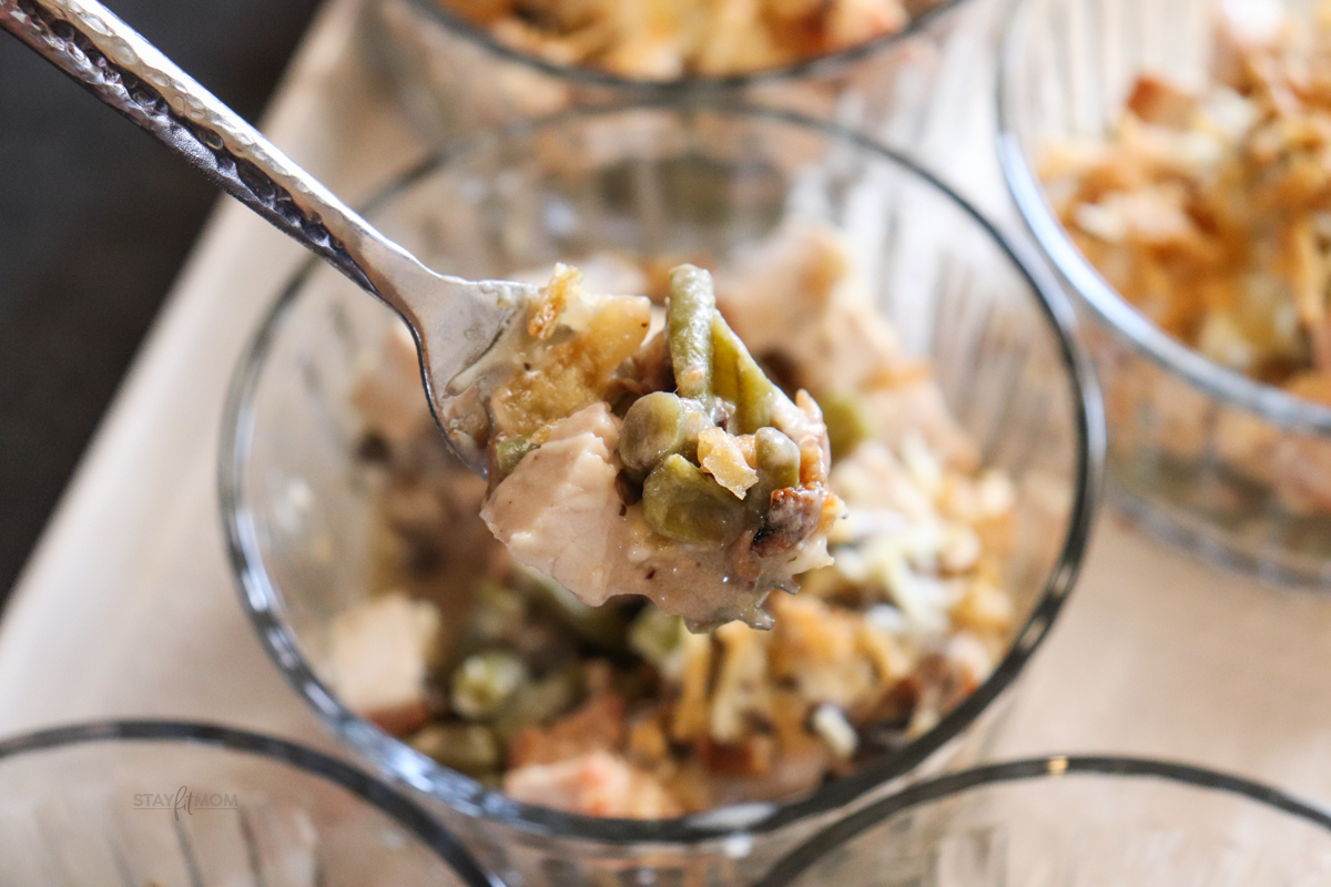 - Stir in half the cheese and fried onions. Evenly distribute into the 5 containers, pouring over the turkey and green beans. Each cup gets about 1/2 cup.