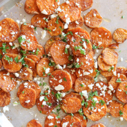 Full sheet pan–This is a larger sized sheet pan and works great for this recipe so you have room to spread the sweet potatoes out for more even roasting.
