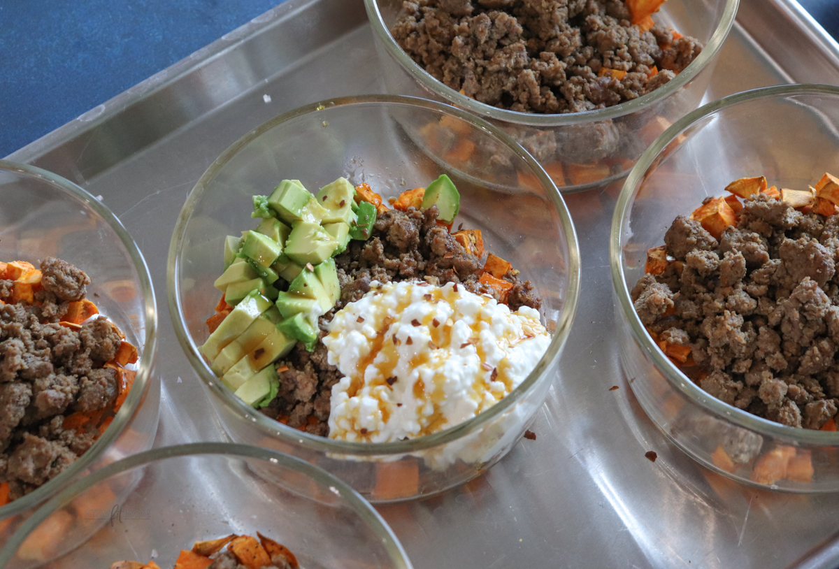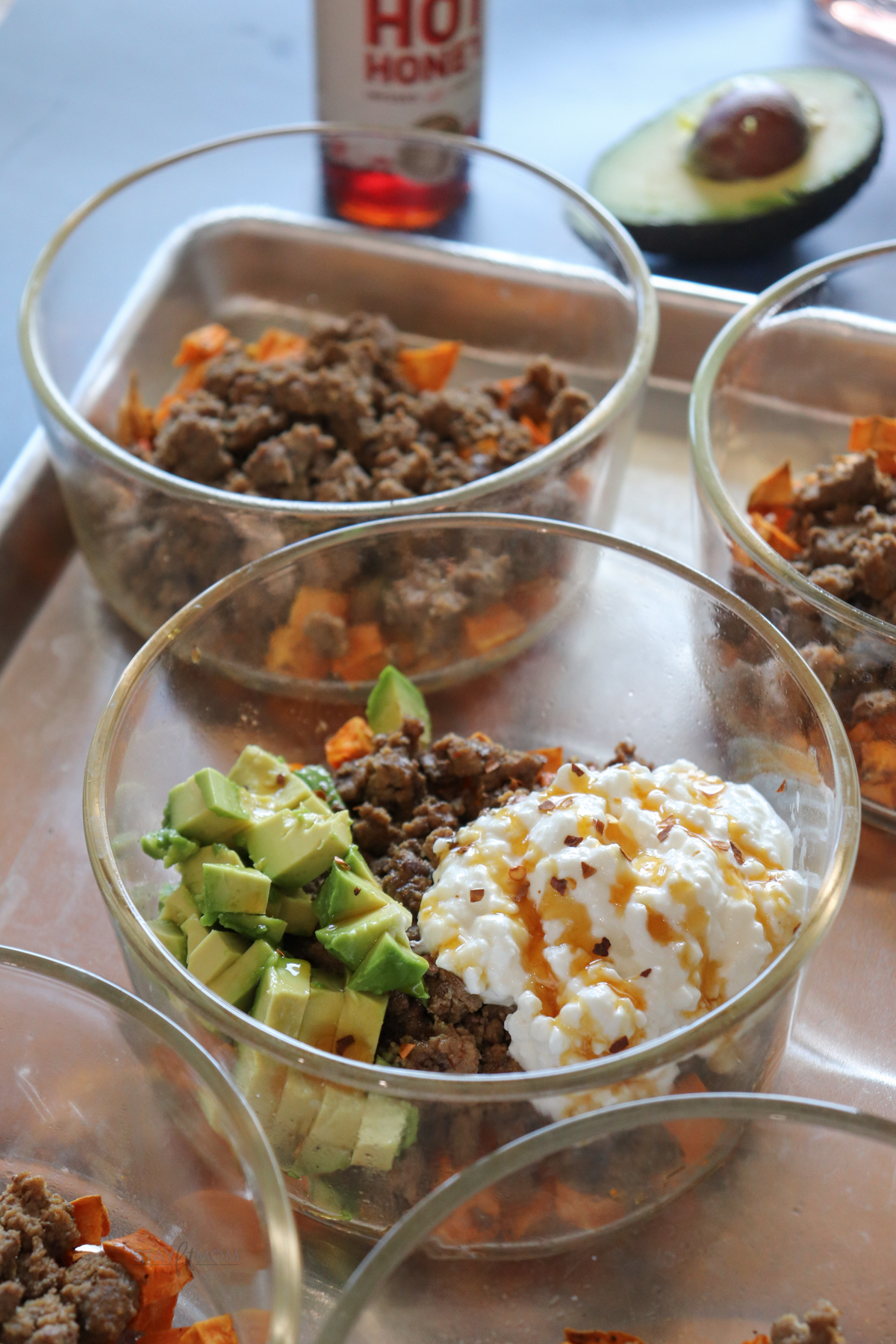 Each bowl starts with roasted sweet potatoes, seasoned lean beef, creamy cottage cheese, fresh avocado, and a drizzle of spicy-sweet hot honey. It’s the perfect combo of sweet, savory, and a little kick of heat — satisfying and macro-friendly!