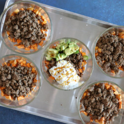 - Layer the cooked beef over the roasted sweet potatoes in oven-safe bowls.