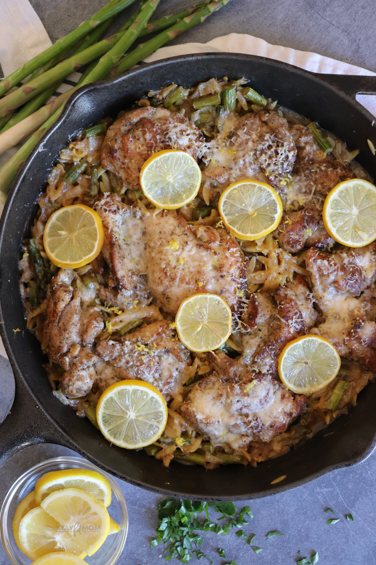 - Find in MyFitnessPal and the MacrosFirst apps by searching Stay Fit Mom One Dish Lemon Chicken Orzo