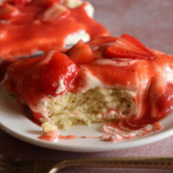 Make this one the day before serving! Prepare the cake, whipped topping, and strawberry “jam” day 1. Day 2 frost the Strawberry Shortcake and serve!