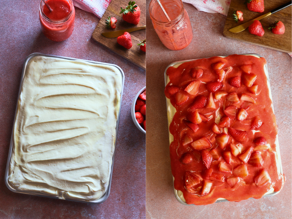 - Poke the cake with a fork all over before topping with the pudding mix. Next layer on the reduced strawberries and sliced strawberries. Enjoy! Refrigerate leftovers.