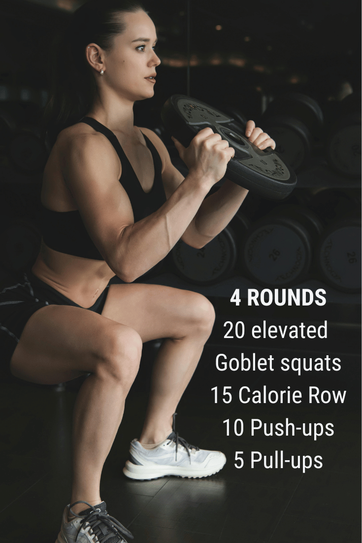 Set a timer and begin with 20 elevated goblet squats. Once complete, move directly into 15 calories on the rower (see modification options if you don’t have access to a rower).
