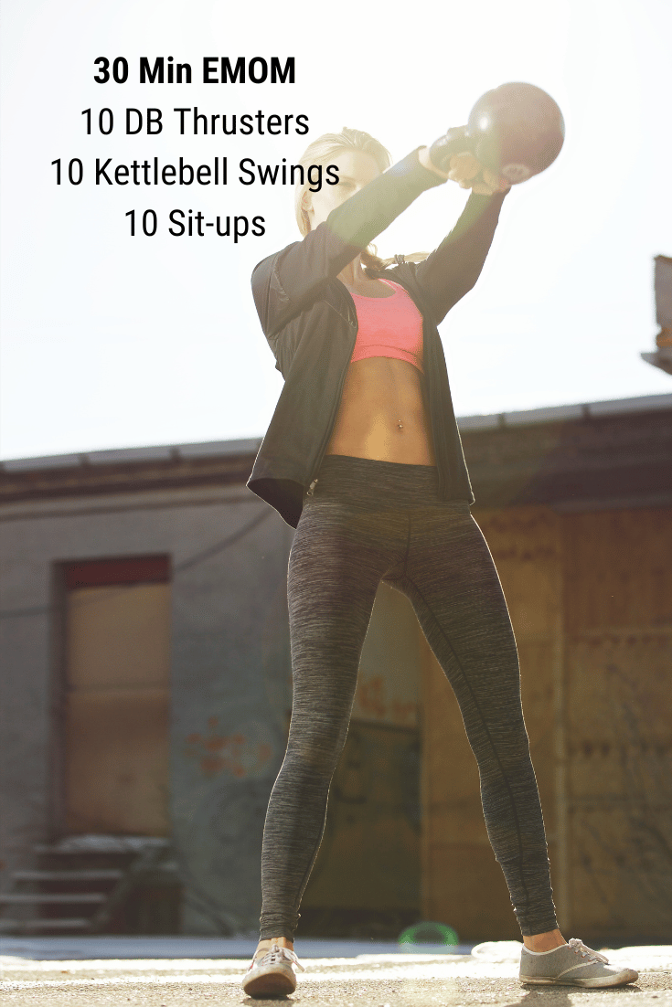 Some days the hardest part of working out isn’t the workout itself—it’s deciding what to do. That’s where this no-thinking EMOM workout comes in. EMOM stands for Every Minute on the Minute, which means you’ll start a new set of movements at the top of each minute and rest for the remainder of the minute once your reps are complete. This simple structure removes the guesswork and keeps you moving with purpose for the full 30 minutes. With dumbbell thrusters, kettlebell swings, and sit-ups, you’ll hit your legs, shoulders, hips, and core while keeping your heart rate elevated—all without overcomplicating your workout. Find all of our minimal equipment workouts here.